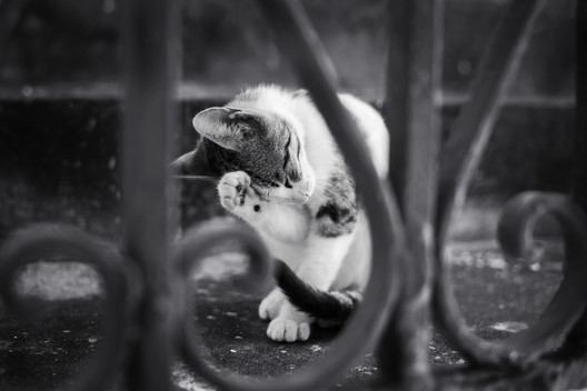 - The framing of this cat in between the ironwork of the fence, and the stark contrast of its coat against the darker grey backdrop makes him almost pop from the image. The line of the curled tail echoes the ironwork, and also serves to draw the viewer's focus up to his grooming paw and face. Nicely done. ~ illona