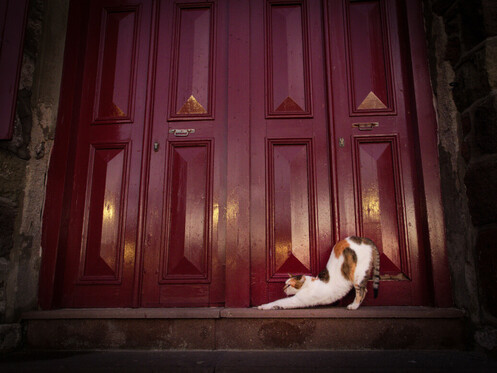 - This is a fabulously rich image ... rich colors and depth, rich textures, and the framing works perfectly with the stretching cat. I think it would be even more striking of an image if you could manage to edit the perspective - widening the left side of the frame vertically - to make this photo seem more square. The one trick with urban shooting is squaring up lines and angles, and often this will have to be managed slightly in post. Either way, a lovely, rich photo. Nicely done.