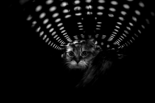 - Wow, this is an absolutely fabulous image. The glare of the cat, centered perfectly in the image, and the leading lines of the carrier's holes/vents, as well as the depth created with such deep black, all work to create an instantly captivating and memorable photo. The fear on this cat's face is obvious, and the lighting from the vents is simply spectacular. Nicely done and congrats on an amazing image!