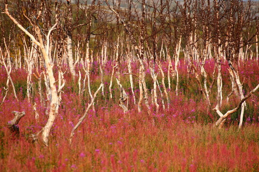 - Thanks for your votes! I shot this image near Abisko in northern Sweden. The bare and damaged birches give room and light to the pink fireweed growing on the ground. I used my Tamron telephoto lens at 300mm with my Canon EOS 6D.