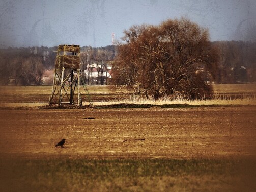 - Thanks for your votes! I took this photo of a barren field with high seat and crow near Magdeburg. I used my Canon EOS 6D with a Tamron tele zoom lens at 300 mm and f/7.1. Post processing was done in Snapseed to achieve the grungy look.